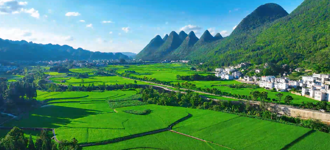 夏日的万峰林,满目皆是一片清凉的绿色。从高空俯瞰,两万多座奇峰连绵不绝,形态各异。峰林下稻浪翻滚,青瓦白墙的村庄掩映在厚重的绿意里,与蓝天白云构成一幅诗意浓郁的山水画卷。